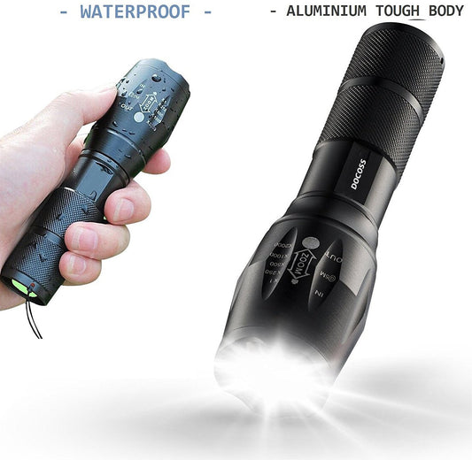 DOCOSS 5 Modes Torch Lights Rechargeable Lights Ultra Bright Cree Led Torch Light Water Resistant High Power Long Distance With Adjustable Focus & Charger (Black, Metal)