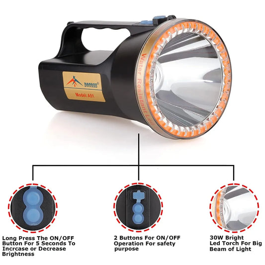 DOCOSS A51 -30 W Torch Light High Power Long Distance Long Range ,4800 mAh / 6-12 Hours High Battery Back up Water Resistance Rechargeable Led Torch Ultra Bright Kisan Search Light(Black)