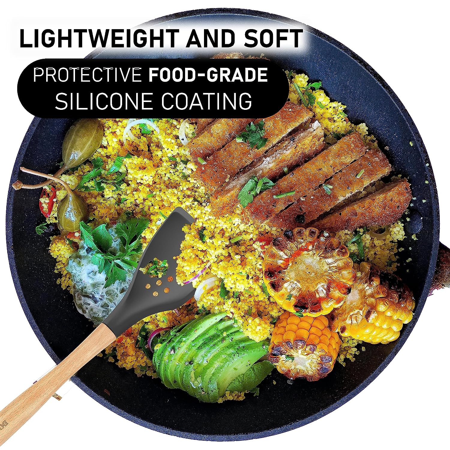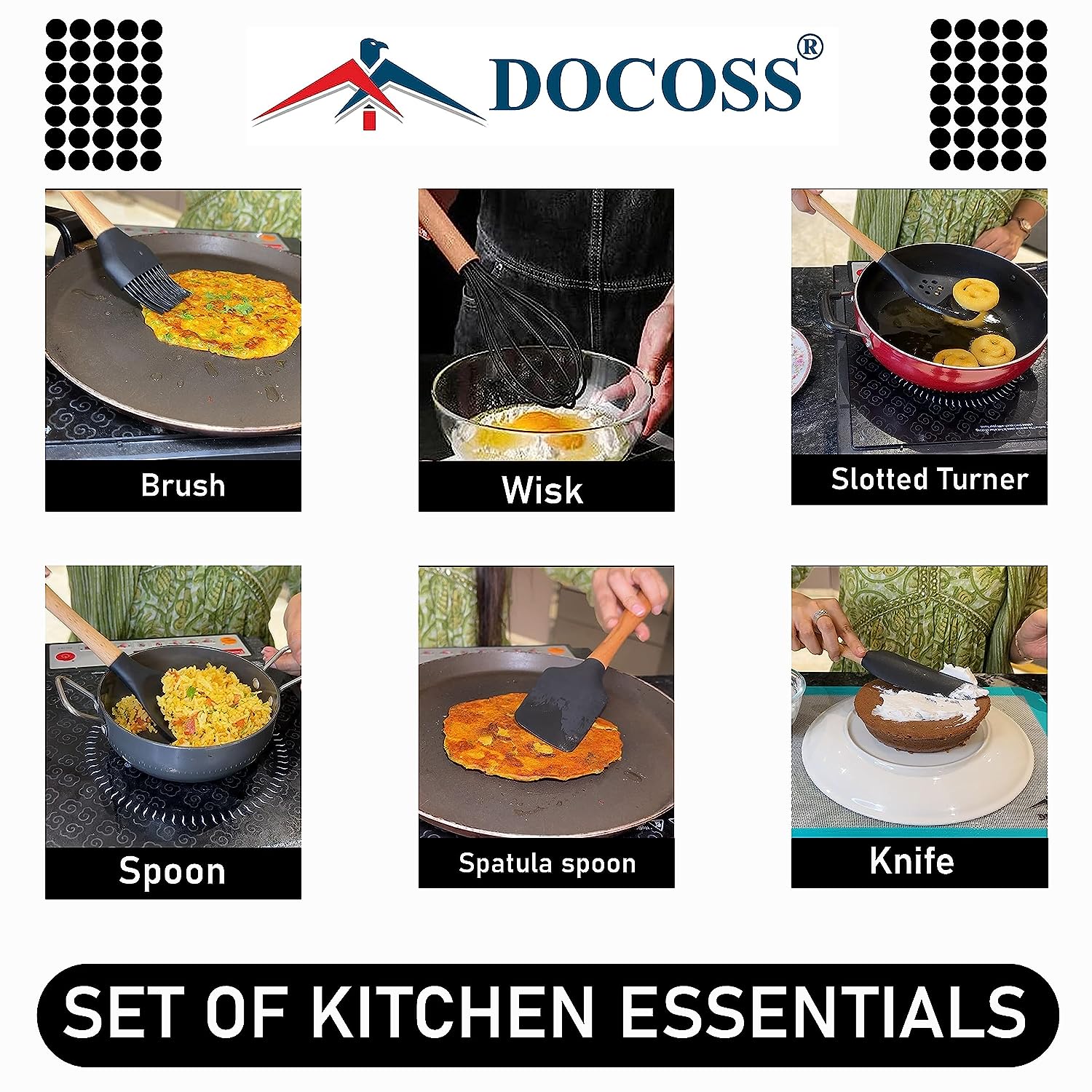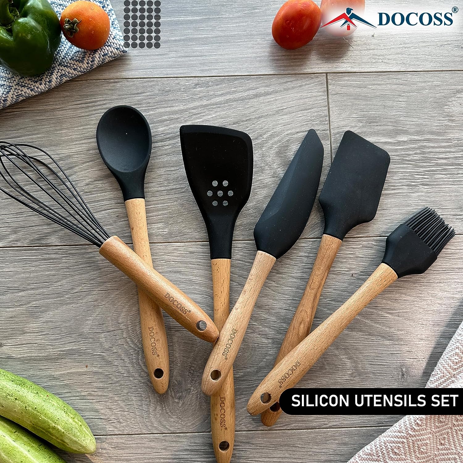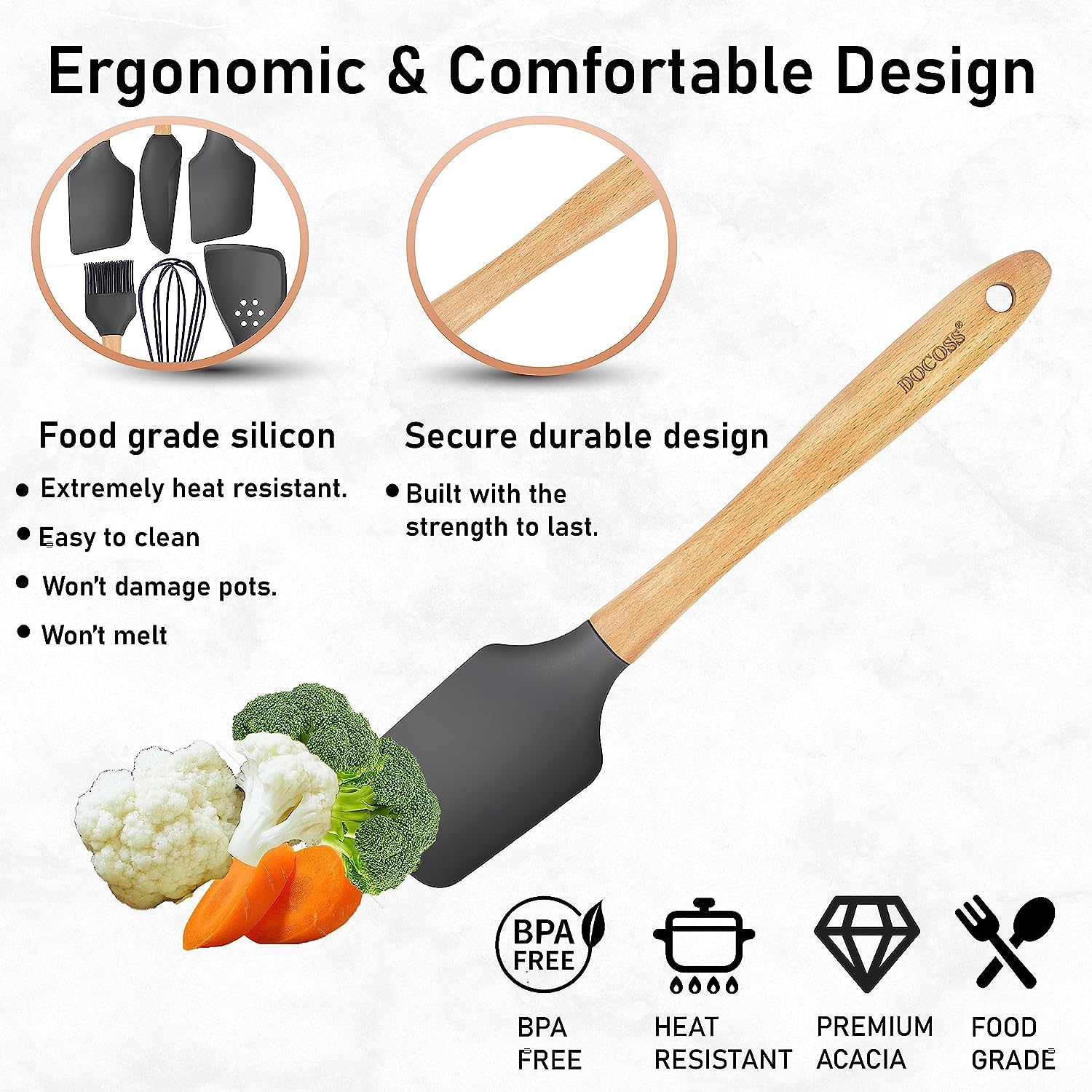 DOCOSS WOODEN HANDLE SILICONE SPATULA FOR KITCHEN --spatula for non stick pan are Easy to use and clean; dishwasher safe and a must have kitchen gadget. Made of 100% BPA free food grade silicone; Eco-friendly; These heat resistant silicone spatula set can be used up to 250 centigrade so you can mix and stir directly in your pans. spatula for non stick pan does not stain and is odor resistant so you'll enjoy them for years to come.Silicone brush & Perfect spatula for cake for folding fruit into batters in your batter bowl; ideal for icing cakes and cupcakes in muffin cup liners ,Cooking spoons for kitchen IS Great for woks and stir fry pans; amazing for removing waffles from waffle makers and flipping eggs or pancakes;dosa spatula for non stick , Larger turner spatula ones allow for bigger jobs; smaller ones are for smaller pots and pans . Won't scratch your nonstick cookware set. With ergonomically designed handles and the perfectly angled head.